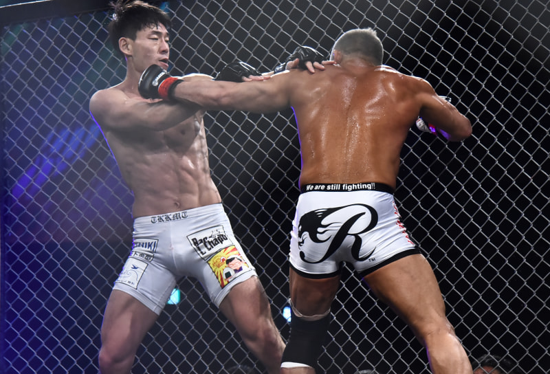3月のGRACHAN初代ウェルター級トーナメント決勝戦で櫻井隆多(右)と激闘を繰り広げた青木忠秀(左)