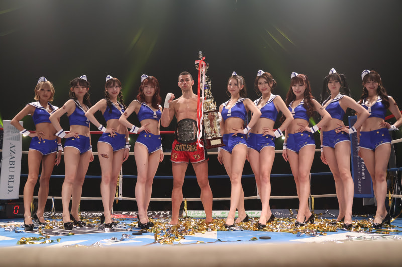 -70kgトーナメント優勝のストーヤンと、うらら(右から5番目)らK-1ガールズが並ぶ