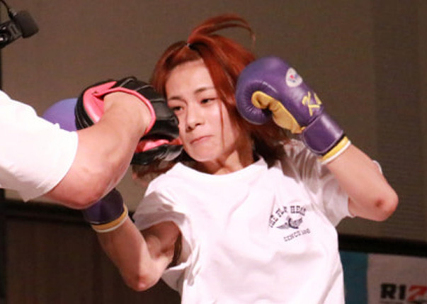 ケイトロータスがミット打ち!シャツから見える腕の筋肉が凄い!