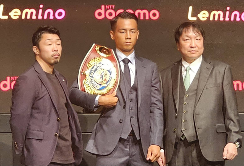 武居由樹(中央)、大橋秀行会長(右)、八重樫東トレーナー(左)