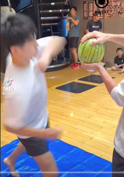 左ヒジ打ちの一撃をスイカへ(『吉成名高公式TikTok』)