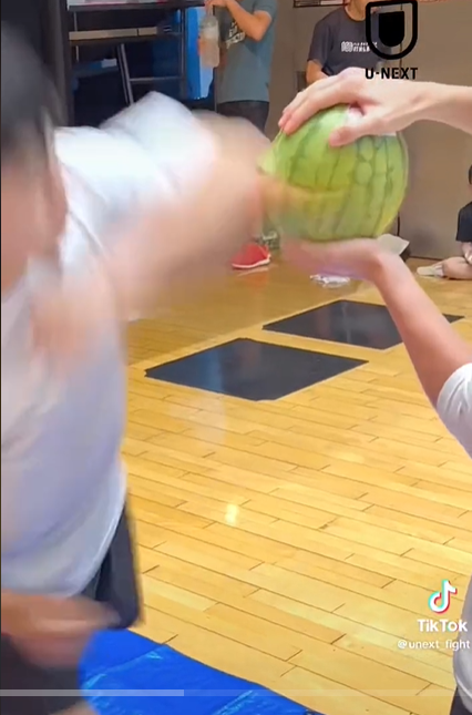 当たる瞬間、スイカに横の切れ目が入る(『吉成名高公式TikTok』)