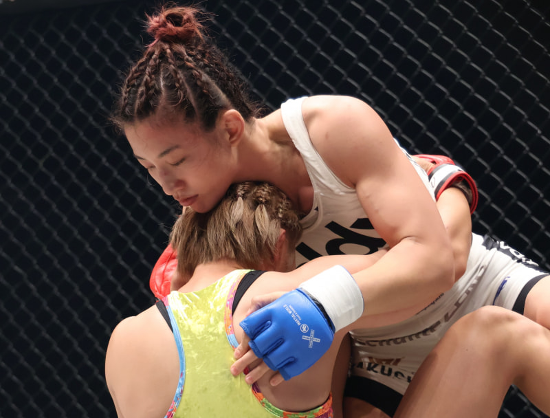 マッチョなボディでグラウンドで攻防を繰り広げる杉山(上)