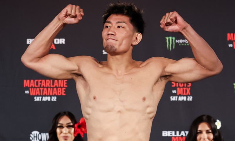 前戦の前日計量でマッスルポーズを決める菊入©️Bellator