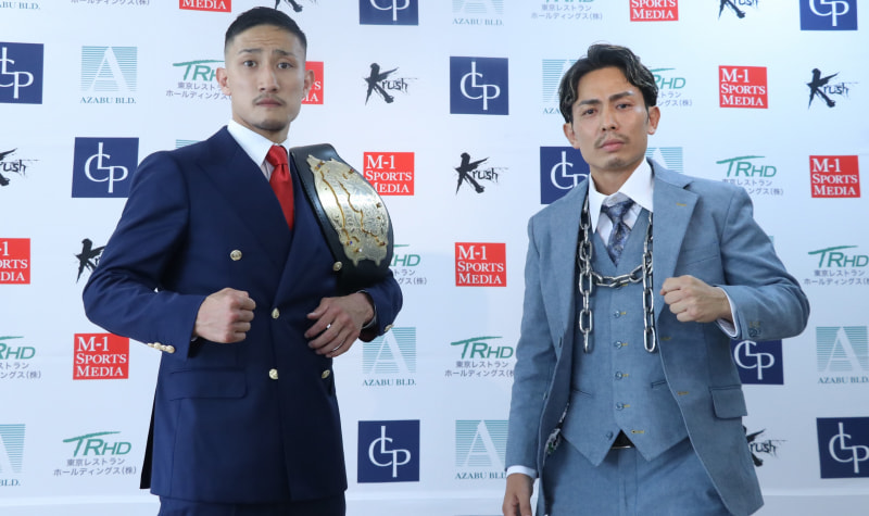 伊藤はベルト、大岩はトレードマークの鎖を首にかけて記念撮影