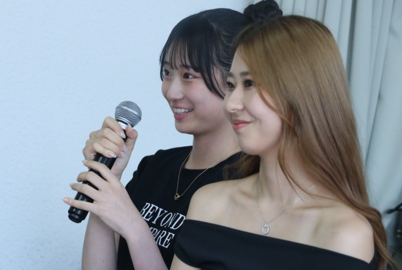 記者席で冨樫(右)と百田(左)が出場選手に質問を飛ばした