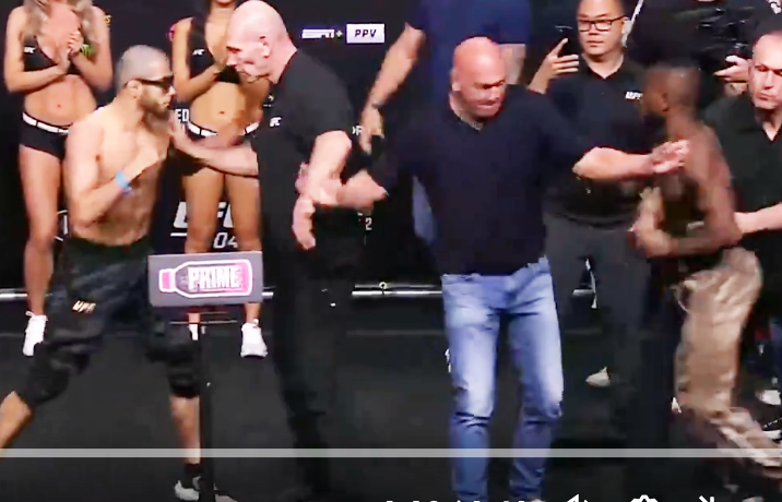 ステージに上がった途端、飛びかかろうとする両者@UFC