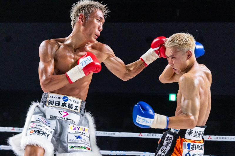 亀田の左カウンターがヒット!(左)、中川との打ち合いを制したⒸ亀田プロモーション