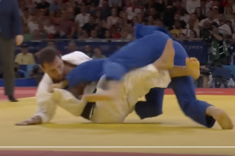 村尾の内股、尻もちに片手だ。両手か上半身の背中、上半身の片側が畳に接地していればポイントになる(@tvtokyosports より)