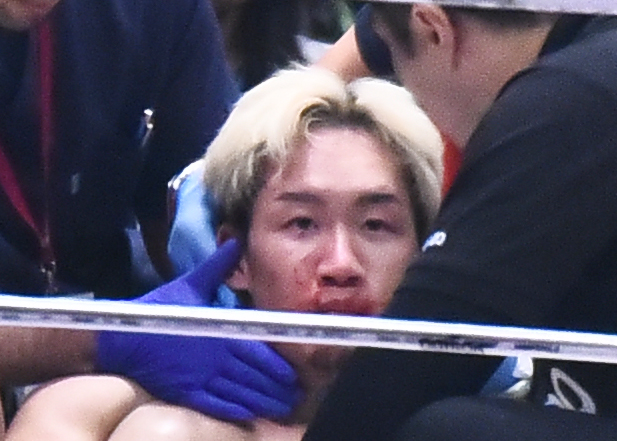 KO負け直後の朝倉、口が切れ周りが鮮血に染まる