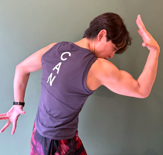 二の腕がよくわかる横向きのポーズを決める=8.7投稿(@10CMD29)