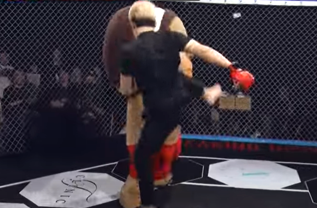 朝倉未来の飛び蹴りを食らう海(ゆるキャラの中身、『朝倉未来YouTubeチャンネル』)