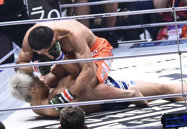 所が右ストレートでダウンしたヒロヤに肘打ち!