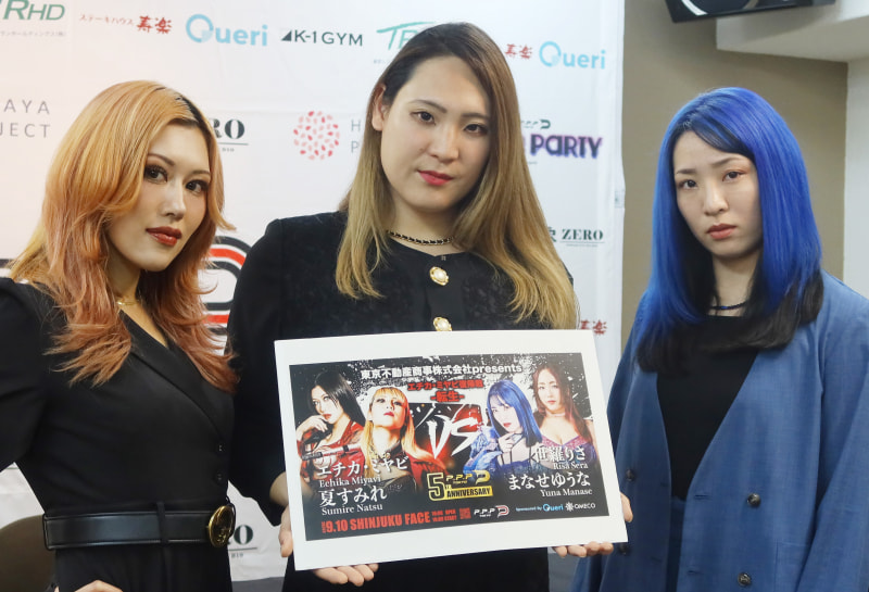 会見に出席した(左から)夏すみれ、エチカ・ミヤビ、世羅りさ