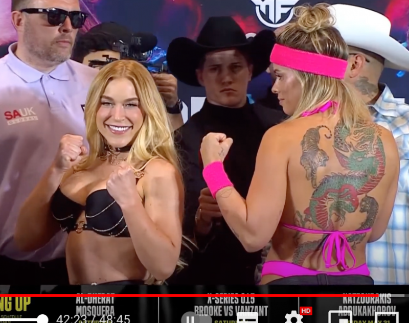 セクシー女優ボクサー、元UFC美女ヴァンザントと“T-バック・ビキニ姿”の鍛えたボディで計量パス!(misfitsboxing公式YouTubeより)