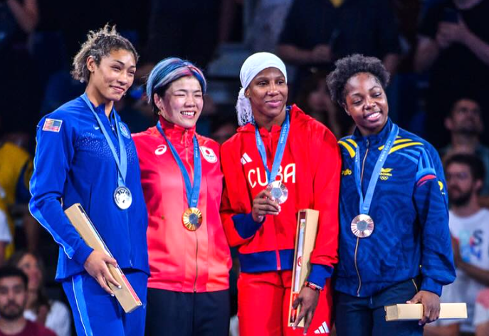 パリ五輪レスリング女子フリースタイル76キロ級で銀メダルを獲得したブレイズ(左、@kennedyblades)