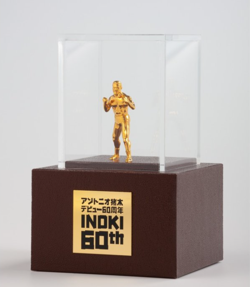 ショーケースで高級感のある純金の猪木像(外箱サイズ高さ約118mm×巾約85mm×約85mm)