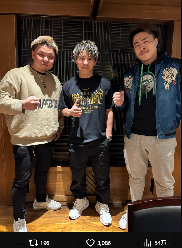 井上尚弥(中央)との記念撮影。右が10人ニキ、左がにっけん君(@daisuke_sdsk)