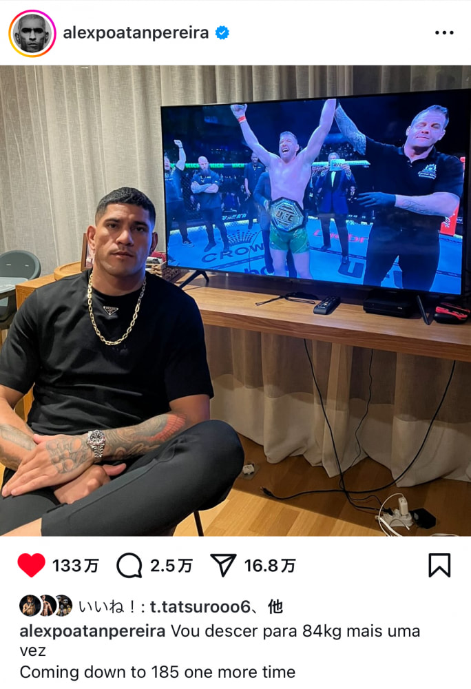ペレイラ、ミドル級復帰を示唆か(@alexpoatanpereiraより)