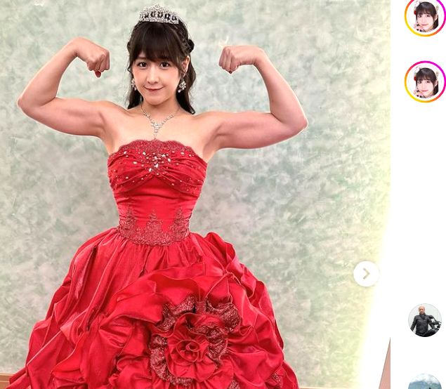 上原わかなは赤いドレスでマッスルポーズ(@wakanauehara_official)