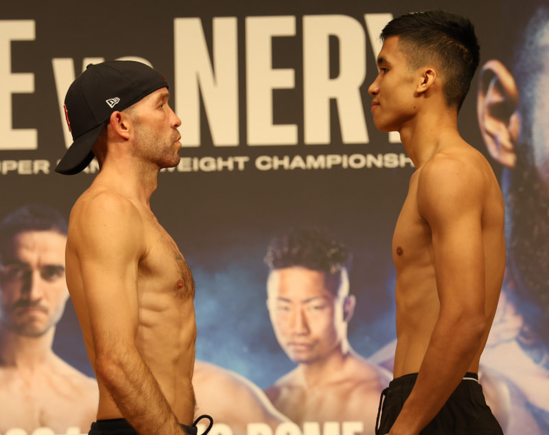 今年5月の計量で対戦相手と向かい合うドヘニー(左)