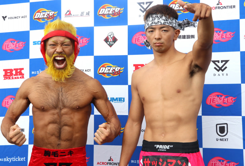 胸毛ニキこと八須(左)が“ナマケモノ”みやび(右)を剛毛マッスルで威嚇