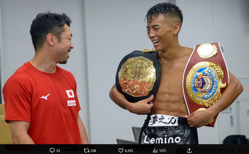 武居が公開した八重樫トレーナーからプレゼントされたK-1のベルト写真(@yoshikitakei712)
