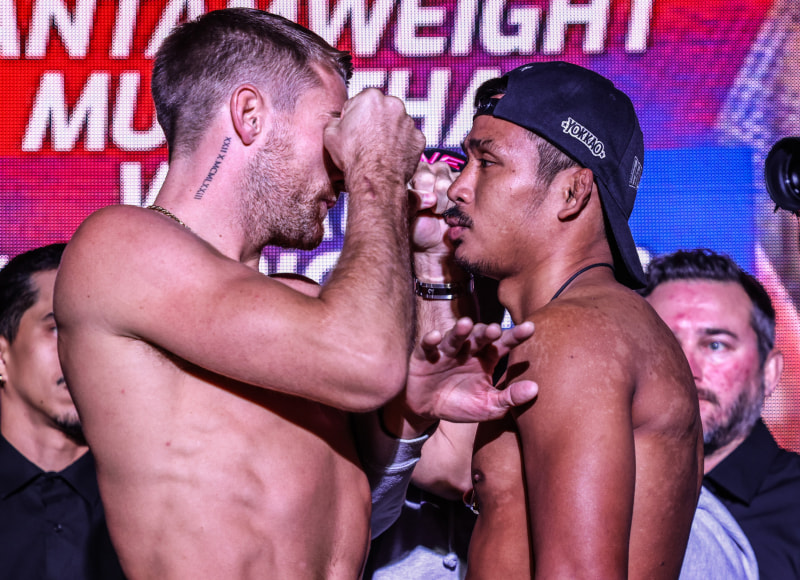 王者ハガティー(左)を睨みつけるスーパーレック(右)©️ONE