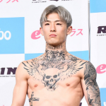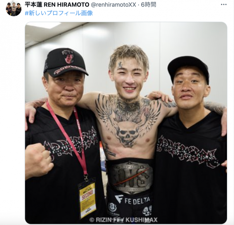 結果が白と発表後、平本の新たなXのプロフィール。顔の平本を中心に左に剛毅會の岩崎宗師、右に剛毅會の大塚隆史が並ぶ