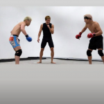 下がローションのヌルヌル状態と思われる試合場で、朝倉(右)は西谷(左)と向かい合った。中央は白川陸斗