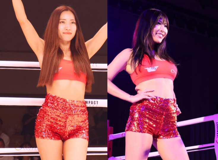 フットネス競技選手のSHINO(左)と美尻を目指すりさぶー(右)がパンプアップしてラウンドガールに立った
