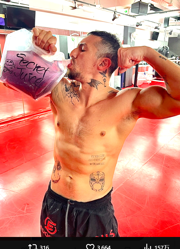 24年7月30日公開、不思議なジュースを飲みながら安保に対戦アピールする木村(朝倉未来の公式YouTubeより)