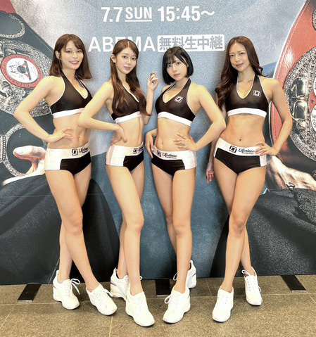 24年7月の井岡戦ラウンドガール。左から葵くみ、上原沙弓理、三橋くん、宇佐美なお