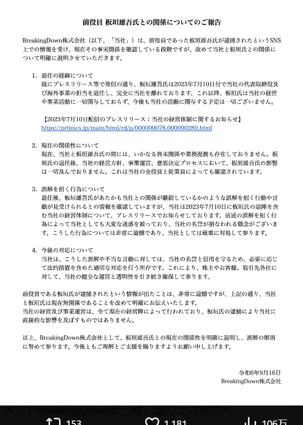 今月16日にBDがSNSに投稿した板垣容疑者との関係を否定する公式文書(@breakingdown_jp)