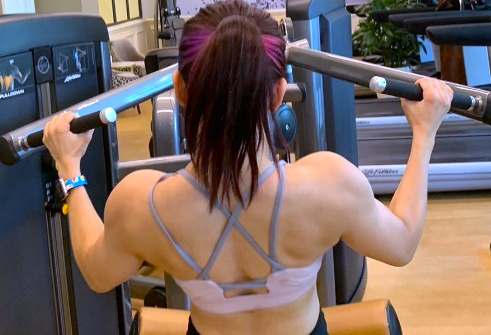 ぱんちゃんは、スポブラ姿で背中と肩周りの発達した筋肉を見せた=アップフォト(24年8月、@panchanrina)