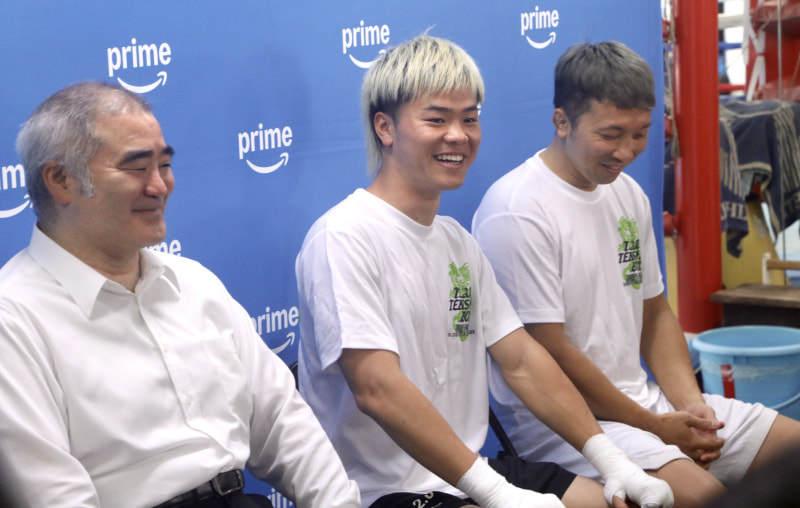 会見で答える那須川、左に浜田剛史代表、右に粟生隆寛トレーナー
