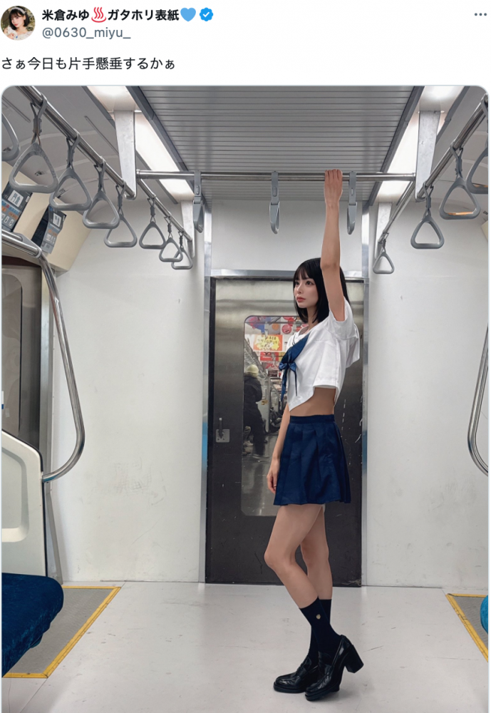 ミニスカセーラー服で片手懸垂しようとする米倉みゆ(@0630_miyu_より)