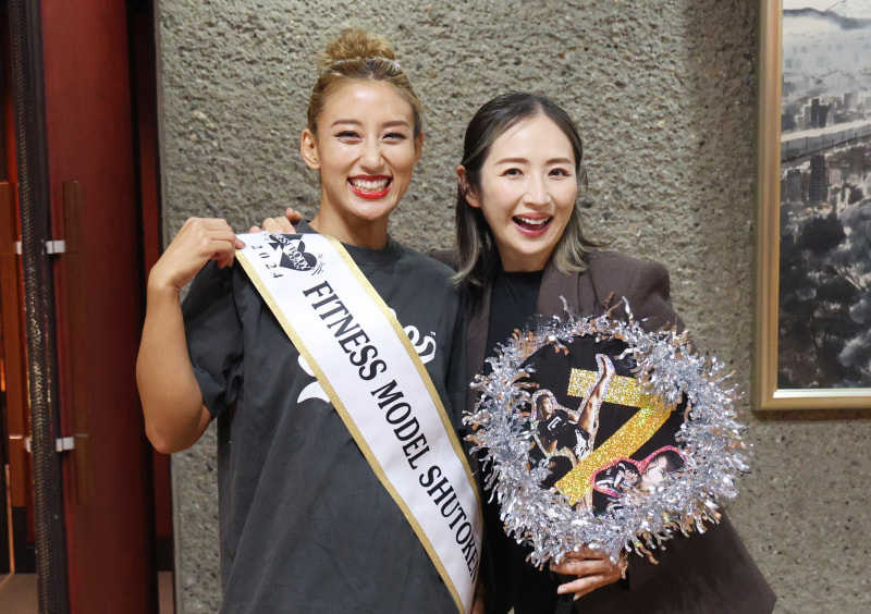 舞台裏で優勝を喜ぶ杉山とトレーニングを教えた愛川ゆず季