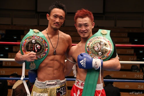 2014年11月15日、大和哲也(右)は梅野源治(左)と共に日本人初WBCムエタイ世界王者となった