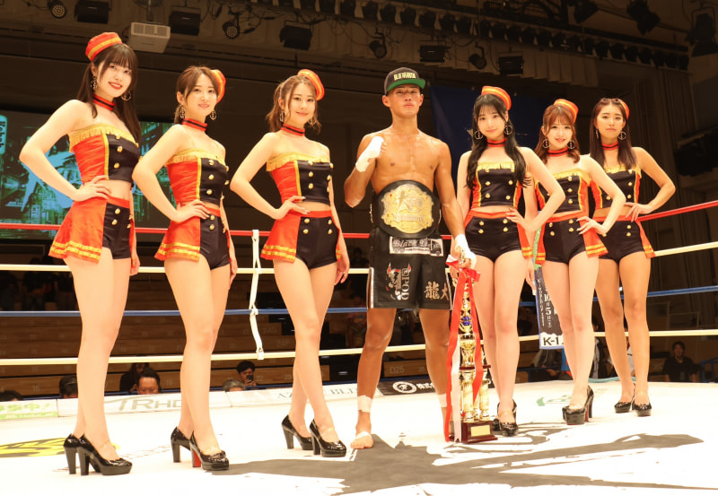 美脚のKrushガールズ6人と、フェザー級王者の石田龍大(瀬戸は左から2番目)