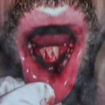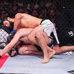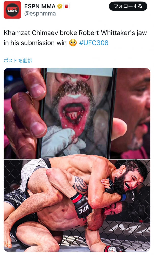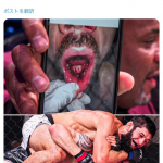 下の前歯が奥に倒れ、壮絶な試合だったことが分かる(@espnmmaより)