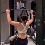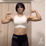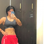 黒のスポブラで割れた腹筋を見せる山岡(右)。左はグラドルの橘渚(@y_seri_1113)
