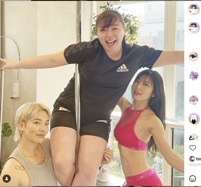 植草が熊田曜子のポールダンスに挑戦(23年3月、植草のインスタより)