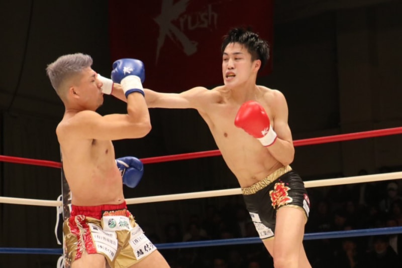 瓦田脩二(右)の長い手から繰り出すパンチ