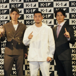 会見に出席した寺島輝(左から2番目)、中島千博(中央)、髙橋直輝(右から2番目)、K-1カルロスP(左)、Krush宮田P(右)