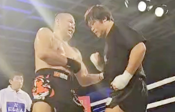 極真ルールで高校3年ぶりに戦った元K-1王者小比類巻貴之(右)と元パンククラチオン王者の桜木裕司(左)