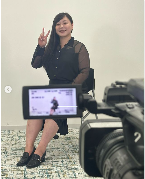 シースルー衣装で取材を受ける植草(植草歩のインスタより)
