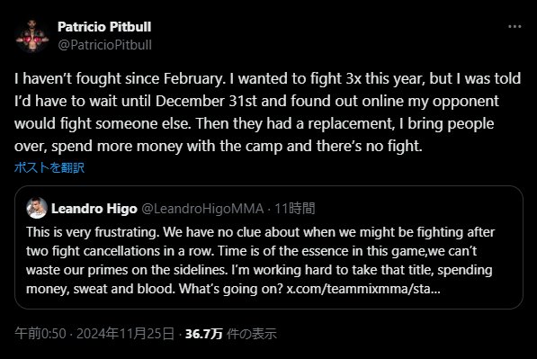 ピットブルは自身のXで不満を述べた(@PatricioPitbullより)