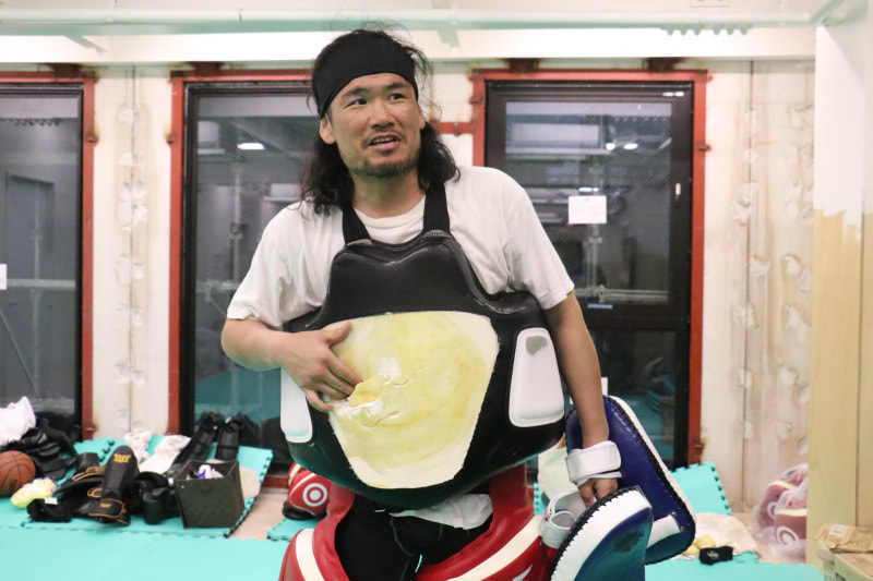 大きく開いた穴に指を突っ込んで苦笑する渡辺トレーナー