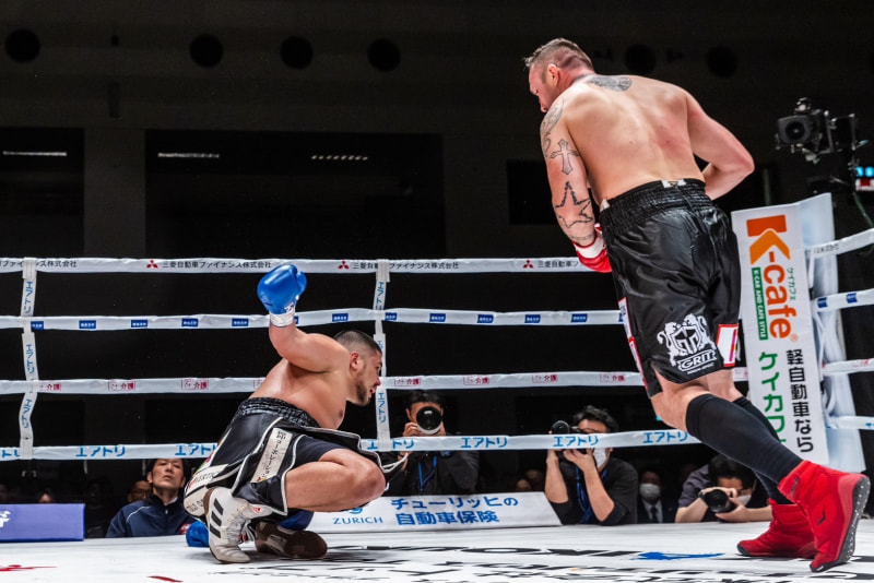 前戦2Rでダウン、初黒星を喫した但馬(左)Ⓒ亀田プロモーション